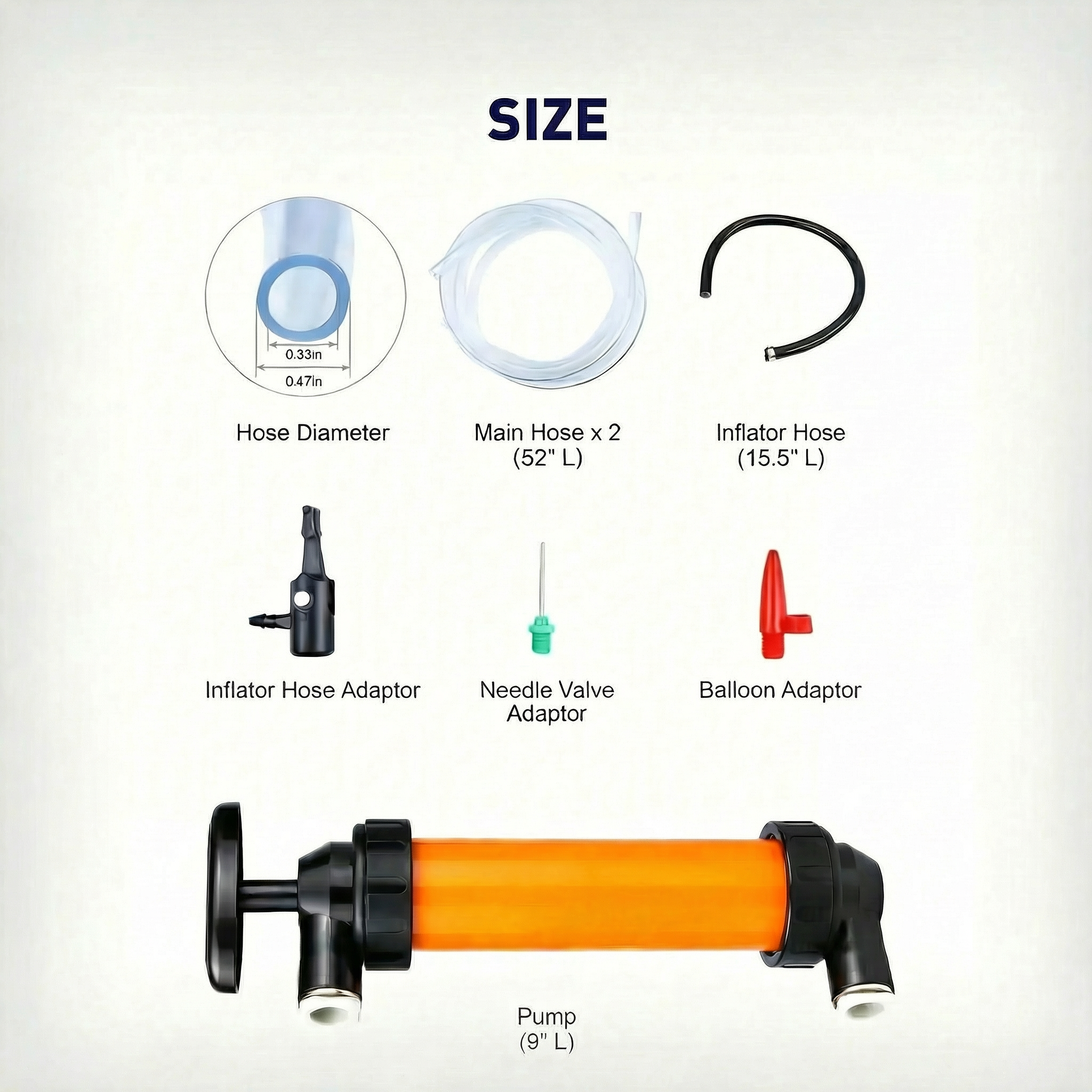 Pump (9" L) + Main Hose × 2 (52" L) + Inflator Hose (15.5" L) + Inflator Hose Adaptor + Balloon Adaptor + Ball Inflation Needle + User Manual
